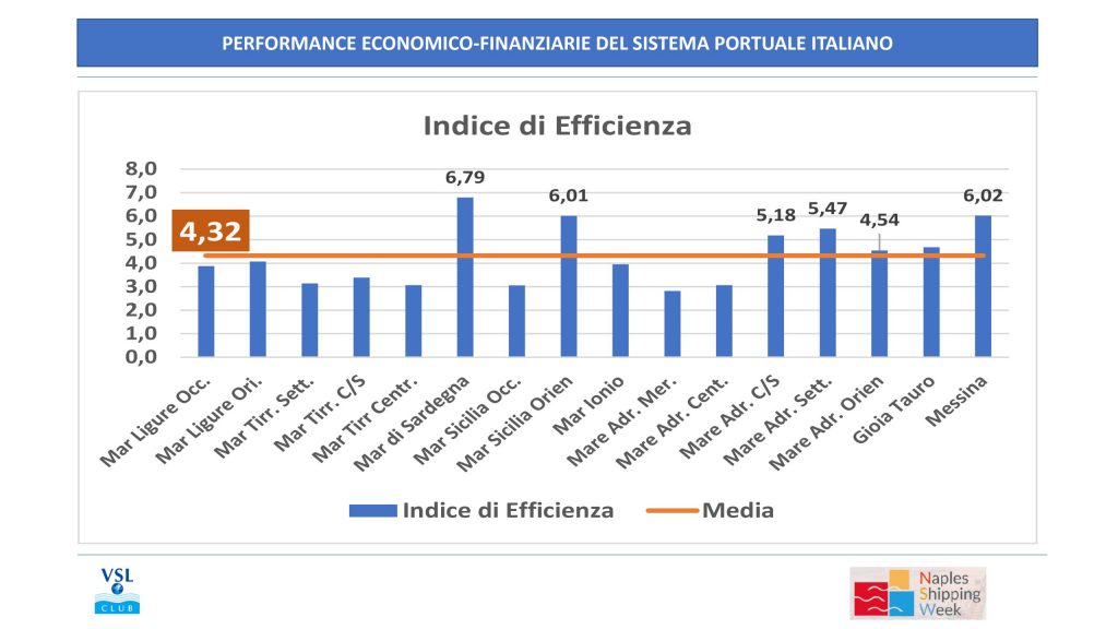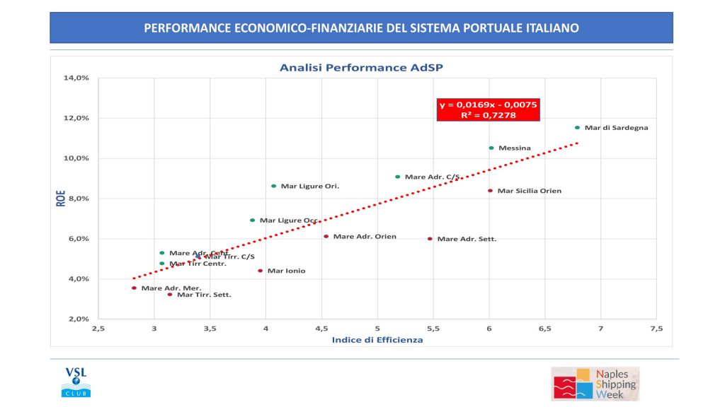 Quella del Mare di Sardegna è l’Autorità di Sistema Portuale italiana che presenta il più alto indice di performance. È quanto emerso dall’analisi del sistema portuale presentato da VSL Club nel corso della sessione “Porti e finanza” della Napoli Shipping Week. Evento annuale, tenutosi qualche giorno fa nel capoluogo partenopeo, dedicato all’economia del mare e, nel caso specifico del panel Ports and Finance, alla portualità e alle ricadute sul Paese, sul quale i porti amministrati dalle AdSP generano flussi di cassa rilevanti e garantiscono una gestione infrastrutturale ottimale dal punto di vista economico – finanziario. Lo specifico studio presentato nel corso del panel dal Dott. Fabrizio Vettosi di VSL Club, ha simulato l’applicazione alle 16 Authorities dei sistemi portuali nazionali, seppur Enti pubblici economici, dei metodi di analisi delle aziende. In tale scenario, il valore di impresa delle AdSP ammonterebbe, complessivamente, a circa un miliardo di euro, paria a: oltre 550 milioni di ricavi operativi (di cui 150 per canoni concessori) e circa 420 di margine operativo lordo (Earnings Before Interests Taxes Depreciation and Amortization) – indicatore impiegato nell’ambito della valutazione aziendale – che è pari al 75% dei ricavi. Ed è proprio da un raffronto tra costi e ricavi, con un incrocio matematico finanziario tra la variabile ROE (Return of equity, indice economico sulla redditività del capitale proprio) e l’indice di efficienza (rapporto tra entrate correnti proprie ed uscite correnti di finanziamento) fissato nell’ambito dell’ultima Relazione sull’attività delle AdSP stilata dal Ministero dei Trasporti, che l’AdSP del Mare di Sardegna raggiungerebbe la vetta della classifica, superando abbondantemente, con un punteggio di 6,79, la media italiana per indice di efficienza, fissata a 4,32. Indice, quello riferito all’Autorità di Sistema Portuale sarda, stabilito su un rapporto che vede, nel dato analizzato