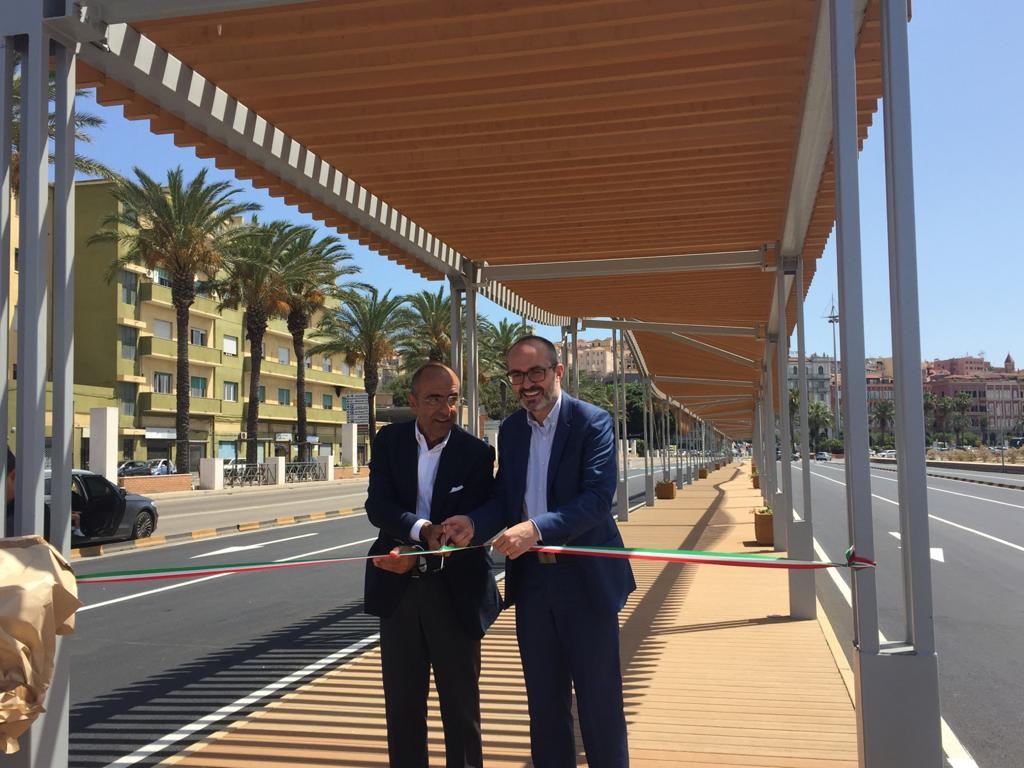 Si chiama “La buona onda”, simbolo di accoglienza per chi viene dal mare e di caloroso arrivederci per chi verso il mare ritorna. Ma anche percorso sicuro per tutti i cittadini che vogliano passeggiare nel tratto libero dell’area portuale. È la nuova opera funzionale, ma dal profondo significato sociale, architettonico e turistico, realizzata dall’AdSP del Mare di Sardegna nel porto di Cagliari e inaugurata, questa mattina, con una breve e sobria cerimonia. Una struttura rimovibile ombreggiante, lunga 140 metri e larga 3, che trasforma radicalmente il tracciato pedonale tra il varco Sant’Agostino ed il centro urbano, restituendo alla libera e sicura fruizione un’altra porzione del waterfront cittadino, impreziosendolo con una soluzione di sicuro valore architettonico – paesaggistico, che si integra pienamente con l’ambiente circostante. Il percorso, realizzato in 5 mesi dall’impresa Elcal Srl, su progetto dell’architetto cagliaritano Gianfranco Sequi, per un importo di circa 274 mila euro, è composto da un’intelaiatura in acciaio, pavimentazione ed una copertura a listelli in legno e resina – appositamente previsti per le installazioni sul mare – che segue un suggestivo andamento ad onda a protezione dai raggi solari. Il tutto è impreziosito da fioriere con essenze tipiche, illuminazione a led e due fontane per dissetarsi e rinfrescarsi. Opera che, dal punto di vista della funzionalità, mette definitivamente in sicurezza un tratto pedonale fino a poco tempo fa delimitato dalla sola segnaletica stradale orizzontale e sul quale gravita, quotidianamente, un notevole flusso di mezzi in ingresso e uscita dall’area ad accesso ristretto del porto. Così concepita, “La buona onda” accompagnerà i cittadini e i passeggeri a piedi lungo il percorso obbligato verso gli imbarchi o il centro città, riparandoli, allo stesso tempo, dalle intemperie o dai raggi solari. La stessa, in funzione delle future esigenze operative del porto, potrà essere spostata, rimodulata e incrementata. “La buona onda, oltre a rappresentare la definitiva soluzione ad una situazione di pericolo e disagio per i cittadini e i passeggeri, vuole essere il riconoscimento alla città di Cagliari per la sua apertura al mare e all’accoglienza – spiega Massimo Deiana, Presidente dell’AdSP del Mare di Sardegna – La struttura, per l’aspetto architettonico e i materiali utilizzati, che ben si inseriscono nell’ambiente portuale circostante, vuole simboleggiare un caldo abbraccio di benvenuto ed un altrettanto caloroso arrivederci a tutti i visitatori che passano dal nostro porto, ed una ulteriore opportunità per i cittadini per riappropriarsi del rapporto con il proprio waterfront. Un messaggio di ritorno a quel calore umano del quale siamo stati privati dalla pandemia, ma anche, e soprattutto, di apertura verso il mondo e verso chi, per piacere, per dovere o alla ricerca di libertà, arriva e parte dal mare”.